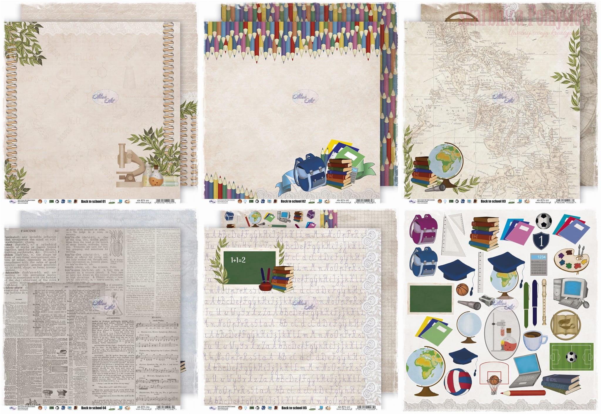 Back to School to kolekcja o tematyce szkolnej, z duża ilością tematycznych grafik do wycinania i uniwersalnymi tłami w stylu vintage. Są tutaj mapy, wzory chemiczne i matematyczne, kod zero-jedynkowy... wszystko, aby tworzyć prace nie tylko o tematyce szkolnej, ale i dla pasjonatów nauki i techniki.