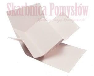 Baza albumowa z grzbietem do wykonania kartki okolicznościowej typu Twist Pop Up 15x15x1cm. Produkt wykonany na prasie, z wykrojnika, posiada bigi prowadzące ułatwiające składanie. Oraz otwory środkujące ułatwiającą umieszczanie środkowej wkładki podtrzymującej album. Produkt składa się z trzech części: okładka, podstawka, album. Składanie jest dość intuicyjne, wszystkie elementy do siebie pasują. Do złożenia produktu potrzebna jest dwustronna taśma klejąca.