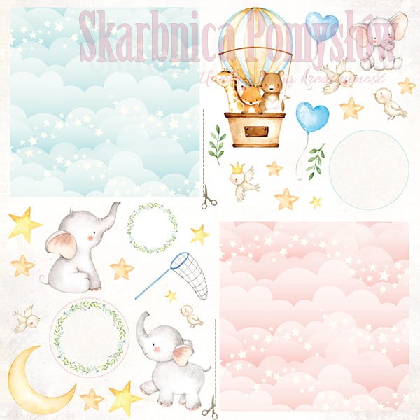Jednostronny papier w rozmiarze 30,5 cm x 30,5 cm z kolekcji Baby Adventure z elementami do samodzielnego wycinania - Craft&You Design.