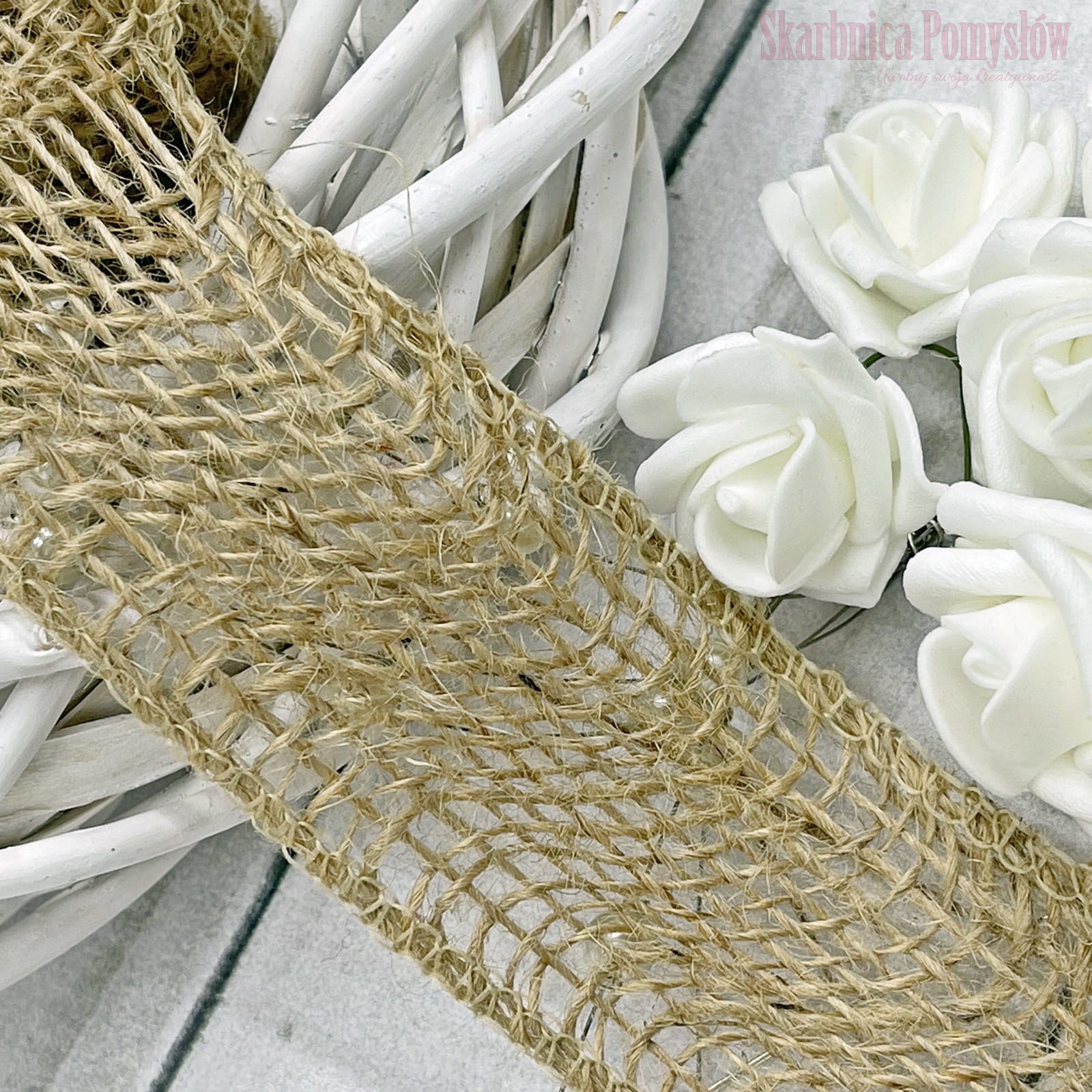 Wstążka z juty o szerokości ok. 4-4,5 centymetrów. Jest ona w naturalnym kolorze. cena za 1 m.