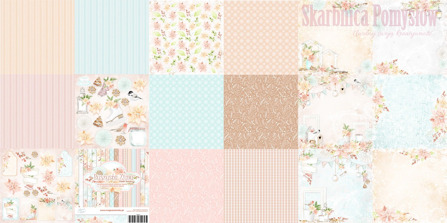 Puszysta Zima to urocza zimowa kolekcja, utrzymana w jasnych, pastelowych kolorach. Jest idealna dla miłośników stylu shabby chic i romantycznych wzorów. Pierniczki, latarenki, jelonki i łyżwy przywodza na myśl beztroski odpoczynek w świątecznym czasie. Kolekcja ta będzie wspaniałą oprawą dla najpiękniejszych wspomnień!