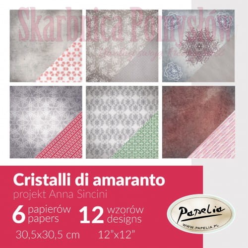 Zestaw papierów do scrapbookingu Papelia – Kryształy Amarantu zawiera 6 dwustronnych arkuszy papieru o wymiarach 30,5 x 30,5 cm, 3 paski 6,8 x 30,5 cm oraz pasek tytułowy o wymiarach 30,5 x 15 cm z nadrukowaną drugą stroną.