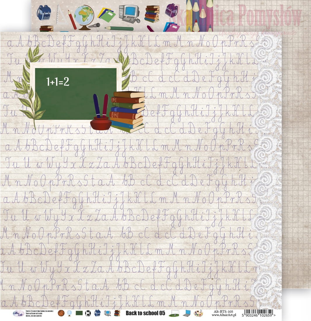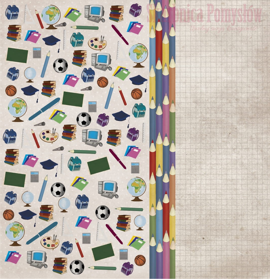 - Papier 5: Papier z grafikami szkolnymi takimi jak literki, cyferki, kredki, piłki, plecaki, globusy. Na drugiej stronie papier zawiera motyw zesztu w linie oraz zielonej szkolnej tablicy. Idealny do prac o szkole, języku polskim. Zawiera wiele elementów do wycinania.