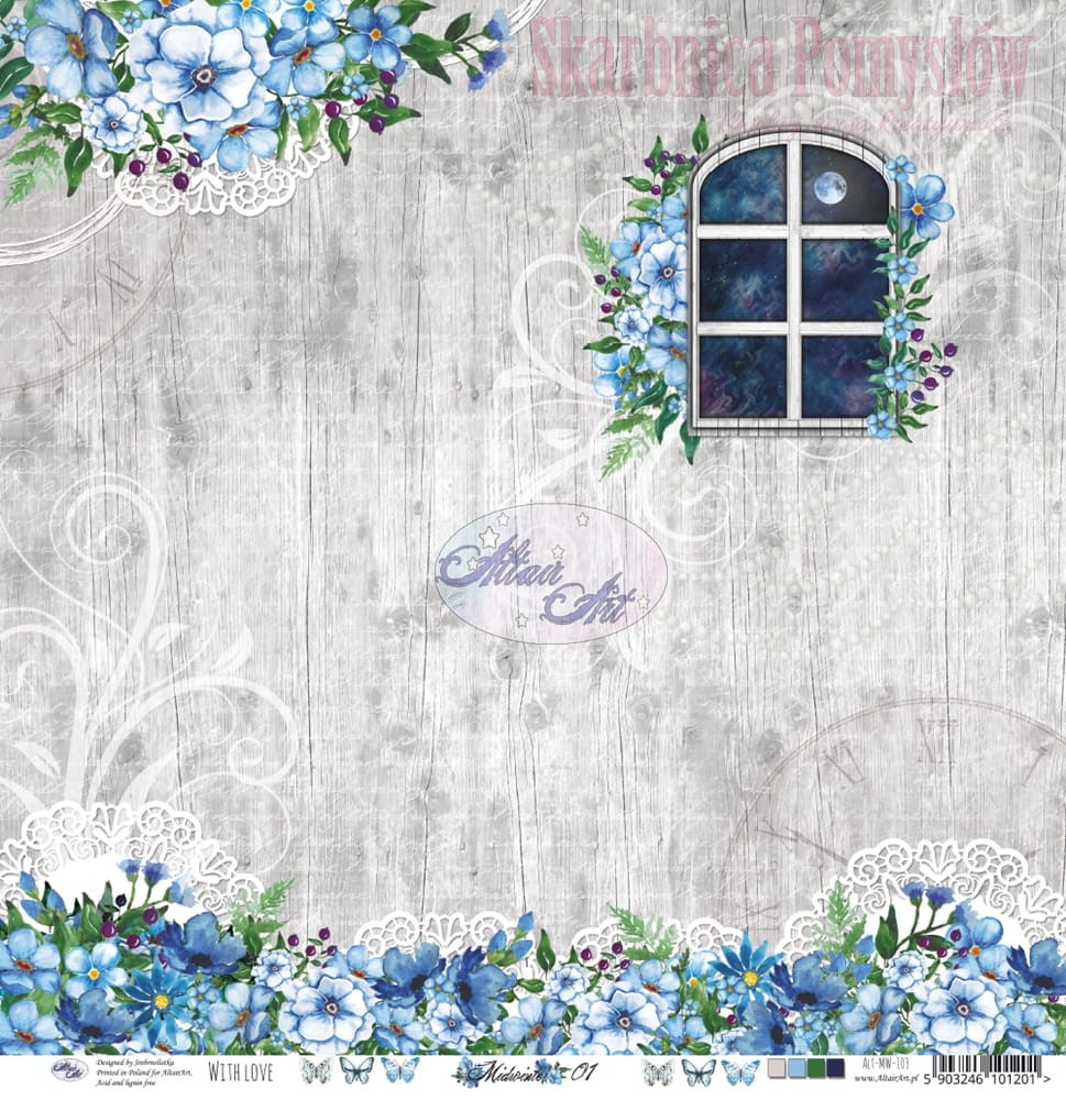 Midwinter to kolekcja papierów do scrapbookingu utrzymana w łagodnych błękitach i szarościach z ciemniejszymi, granatowymi akcentami i motywami, ukwiecona i delikatna. Przynosi spokój zimowej nocy, jasnej, oświetlonej światłem księżyca. Jest idealna dla marzycieli i romantyków, kochających kwiaty, koronki i drewno, tych, którzy uwielbiają jasne noce wpatrzeni w srebrną tarczę księżyca w pełni. Bogata kompozycja i duża ilość dodatków do wycinania będzie idealną oprawą dla najpiękniejszych wspomnień, będzie idealna do tworzenia kartek świątecznych, zimowych, ale także dziecięcych i na inne okazje.