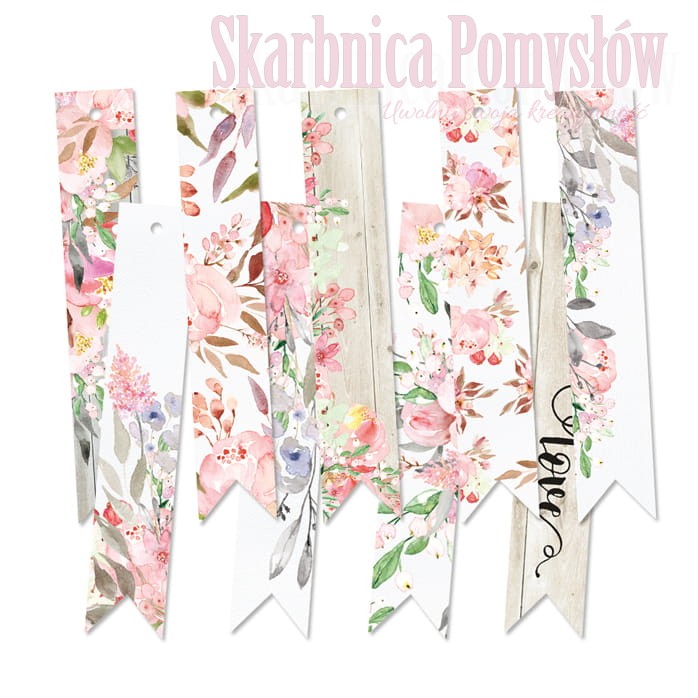 Zestaw tagów, zawieszek 03 z kolekcji Love Bloom. W zestawie 9 tagów, nadruk dwustronny. Rozmiar: 1,9 x 10,4cm