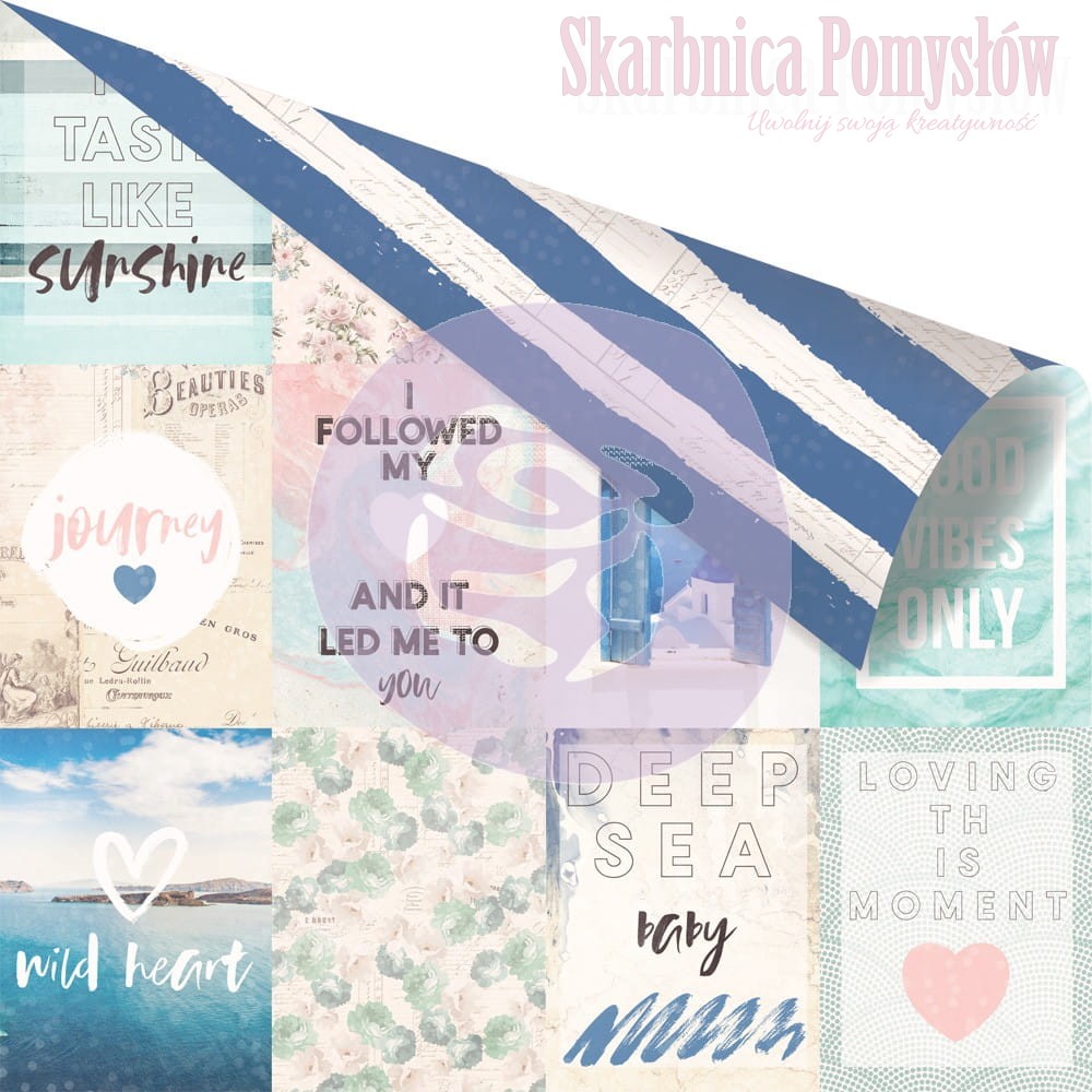 Dwustronny papier do scrapbookingu z kolekcji Santorini o wymiarach 30,5x31,5 cm. Piękne, kolorowe wzory w klimatach śródziemnomorskich idealnie sprawdzą się w pracach wakacyjnych :) Zawiera metaliczne inkrustracje w kolorze srebrnego turkusu.