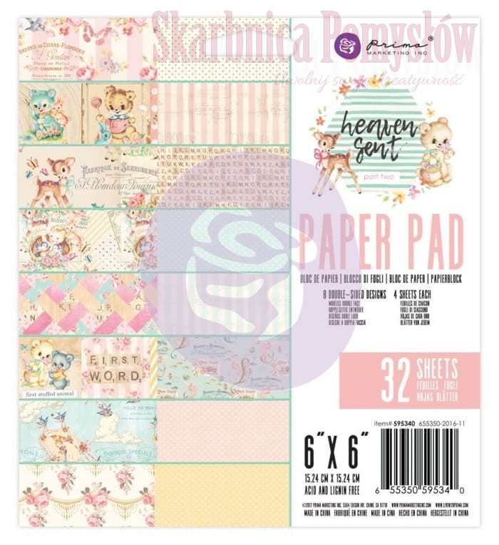 Zestaw papierów o wymiarach 15x15cm. W skład zestawu wchodzą 32 dwustronne papiery - 8 wzorów, po 4 arkusze z każdego wzoru, z kolekcji Heaven Sent 2 - pełnej bajkowych motywów dziecięcych w najpiękniejszej kolorystyce i wzorach, aby ozdobić zdjęcia naszych małych pociech.