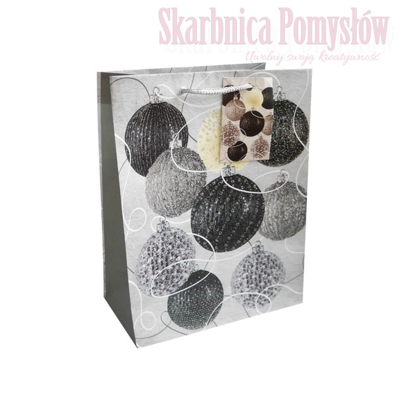 Torba prezentowa z brokatem, rozmiar 18 x 23cm, brokatowe szare bombki